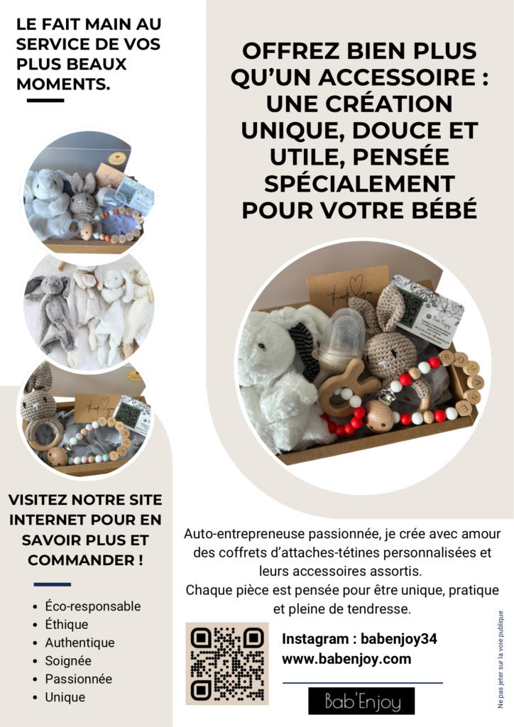Maman avant tout, j’ai créé Bab’Enjoy pour proposer des coffrets faits main, prêts à offrir, qui accompagnent avec douceur les premières années des tout-petits.